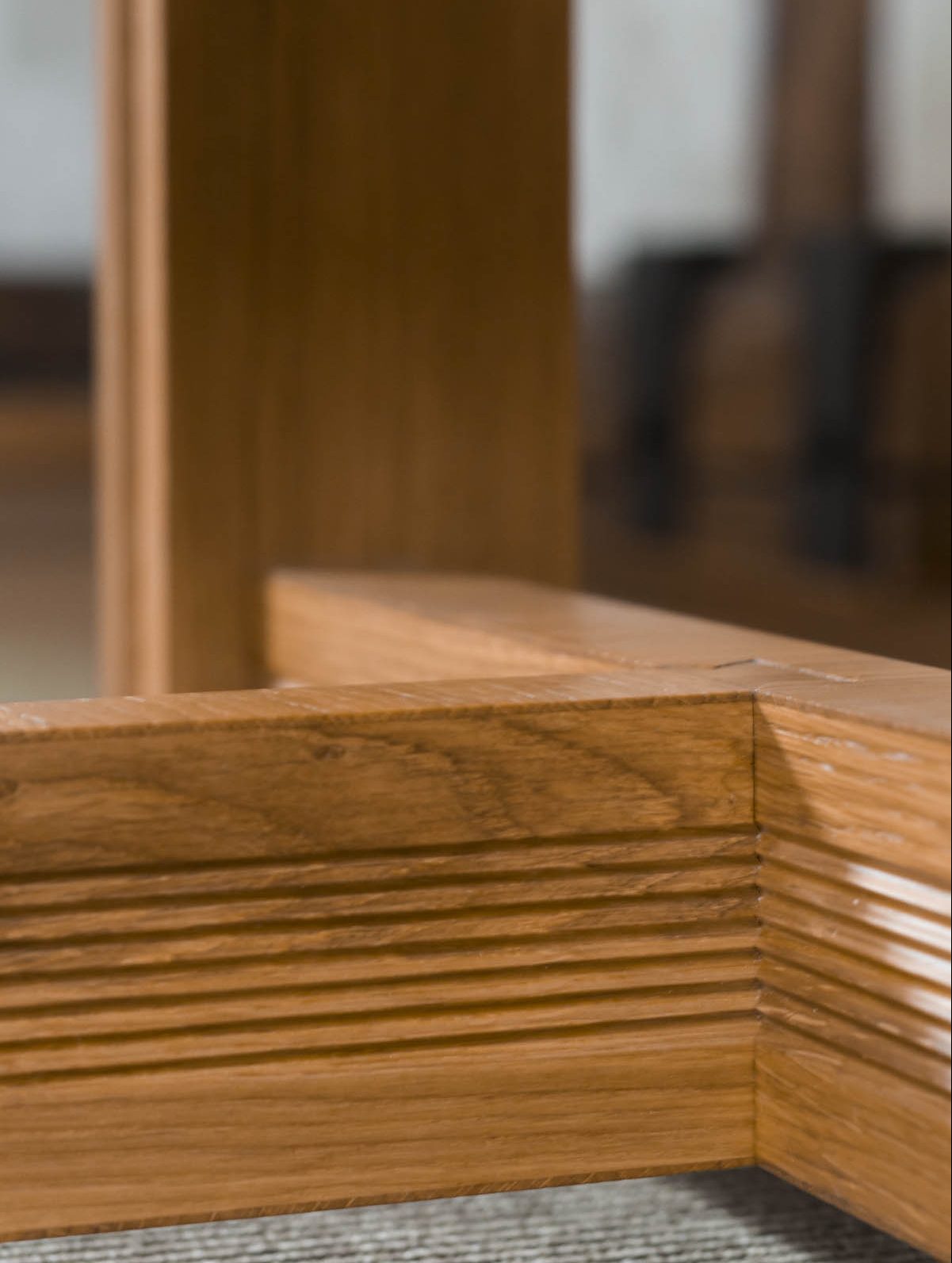 Specifické zadání rozměrného a cíleně robustního stolu do jednací místnosti klubového charakteru v podkrovním prostoru nalezlo inspiraci v nábytkové tvorbě progresivní větve hnutí arts & crafts (F.L. Wright, G. Stickley)